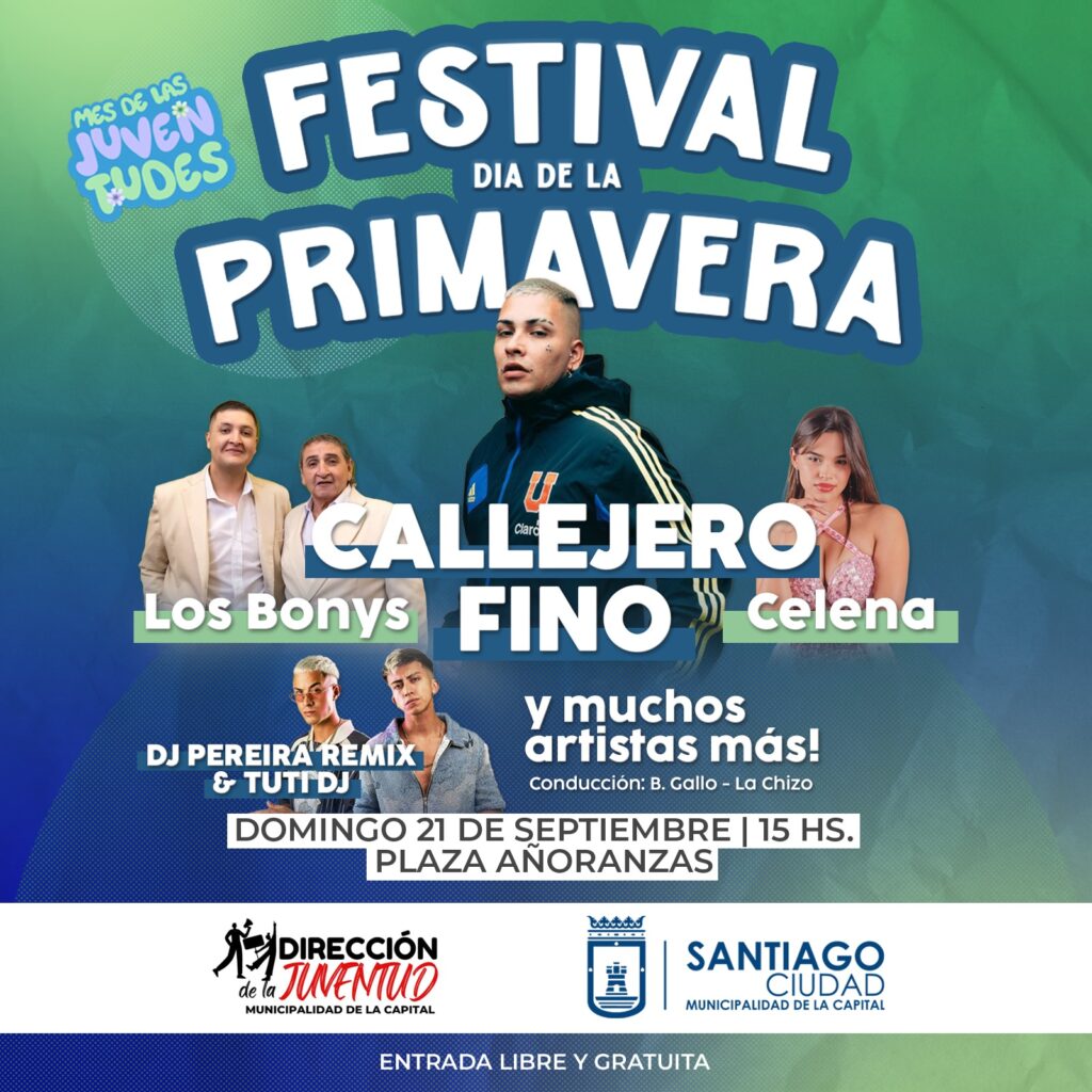 La Municipalidad de la Capital organizará un festival el próximo domingo 21, en el Día de la Primavera y de los Estudiantes con entrada libre y gratuita y con la presencia de destacados artistas de diferentes géneros musicales.En el escenario de plaza Añoranzas, se presentarán Callejero Fino, Tuti DJ ft. DJ Pereira Remix, Los Bonys, Celena, Orfebres, JL y Los Buenos del Cuarteto, Chavakanos, Rocío Gonzalez de La Voz Argentina y los Dj invitados Soga, Esteban Díaz y Lautaro Navarrete.Se trata del tradicional festival que convoca a la juventud en un espacio de recreación y de confraternidad entre amigos.